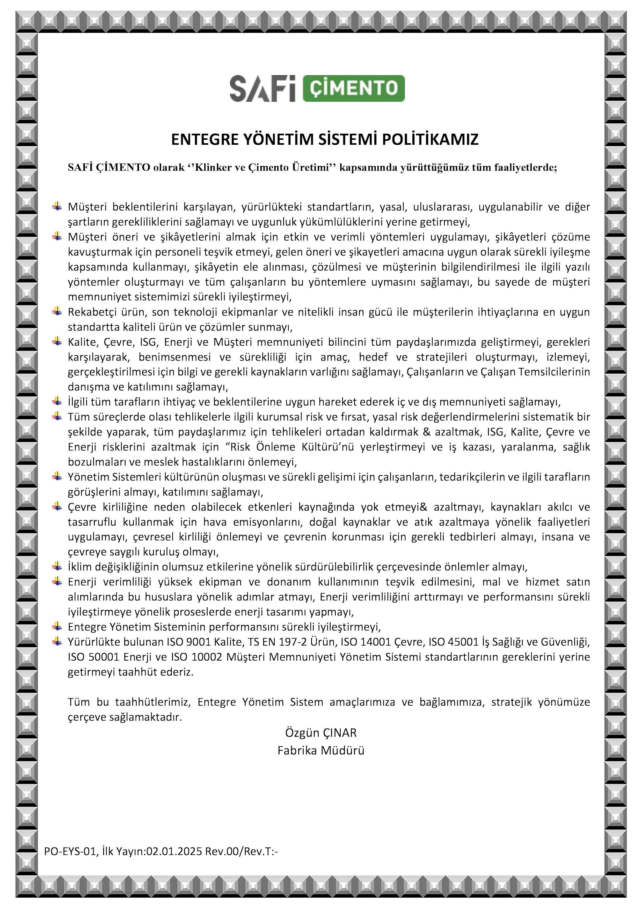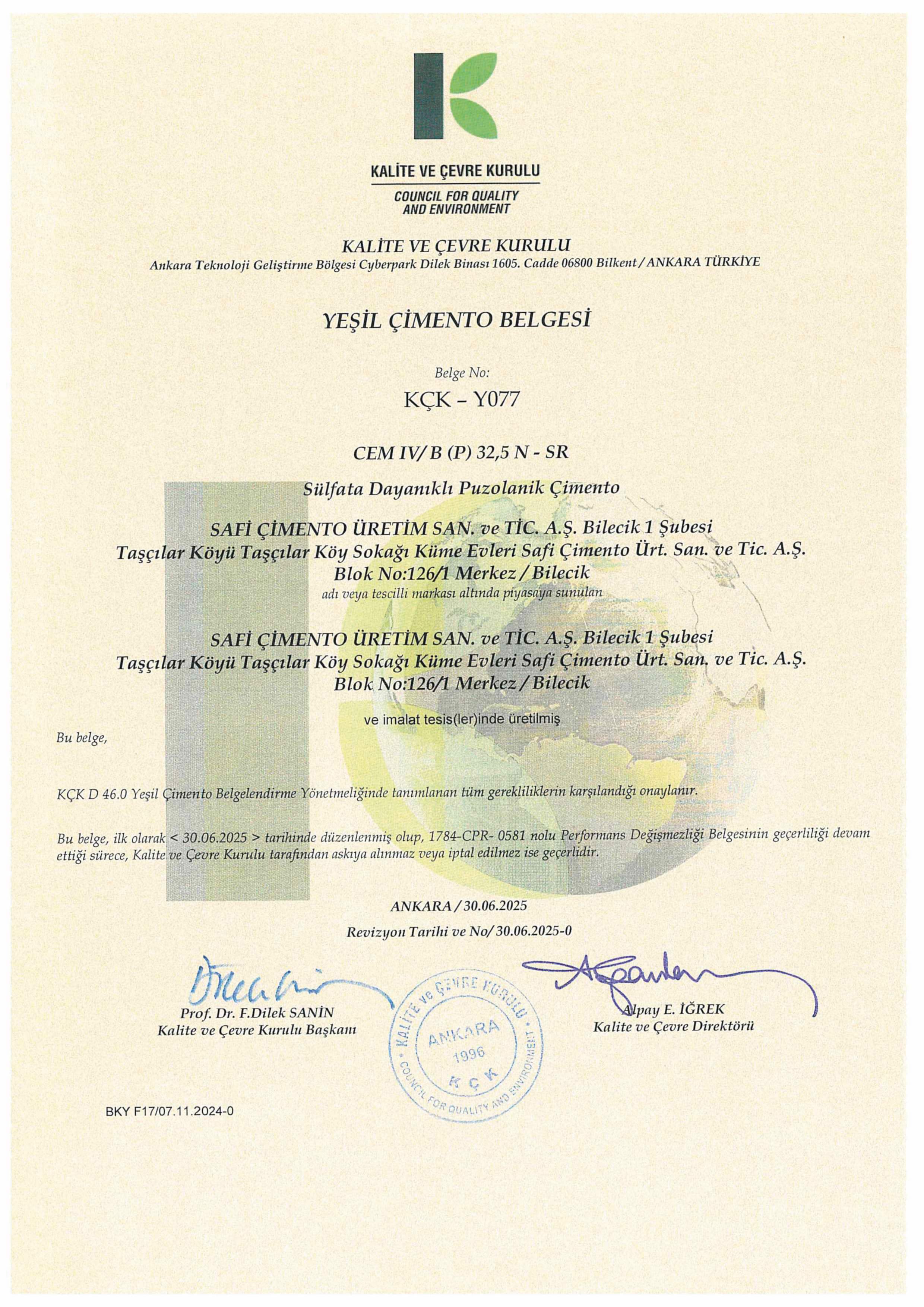 Yeşil Çimento Belgesi - CEM IV/B (P) 32,5 N - SR